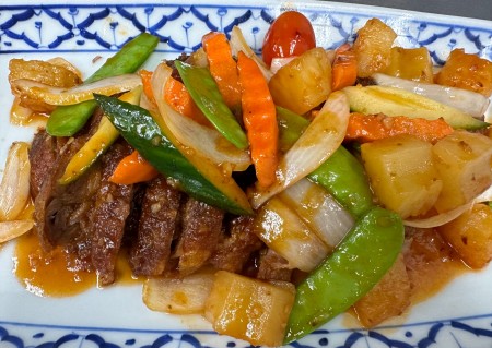 Crispy fried duck topped with pineapple, cucumbers, tomatoes, onions, peas and carrots in sweet & sour sauce..