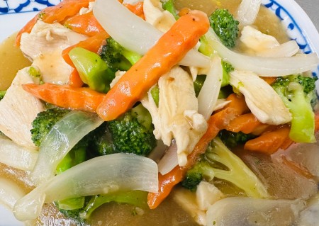 Mixed vegetables* and onions stir-fried in a light brown sauce.